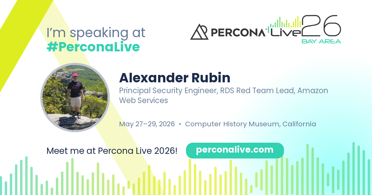 Alexander was working as MySQL principal consultant/architect for over 15 years, started with MySQL AB in 2006 (company behind MySQL database), Sun Microsystems, Oracle and then Percona. His security pentest/red teaming interest started with playing CTFs and performing opensource security research. Alexander is leading RDS (relational database as a service) Red Team at Amazon Web Services.